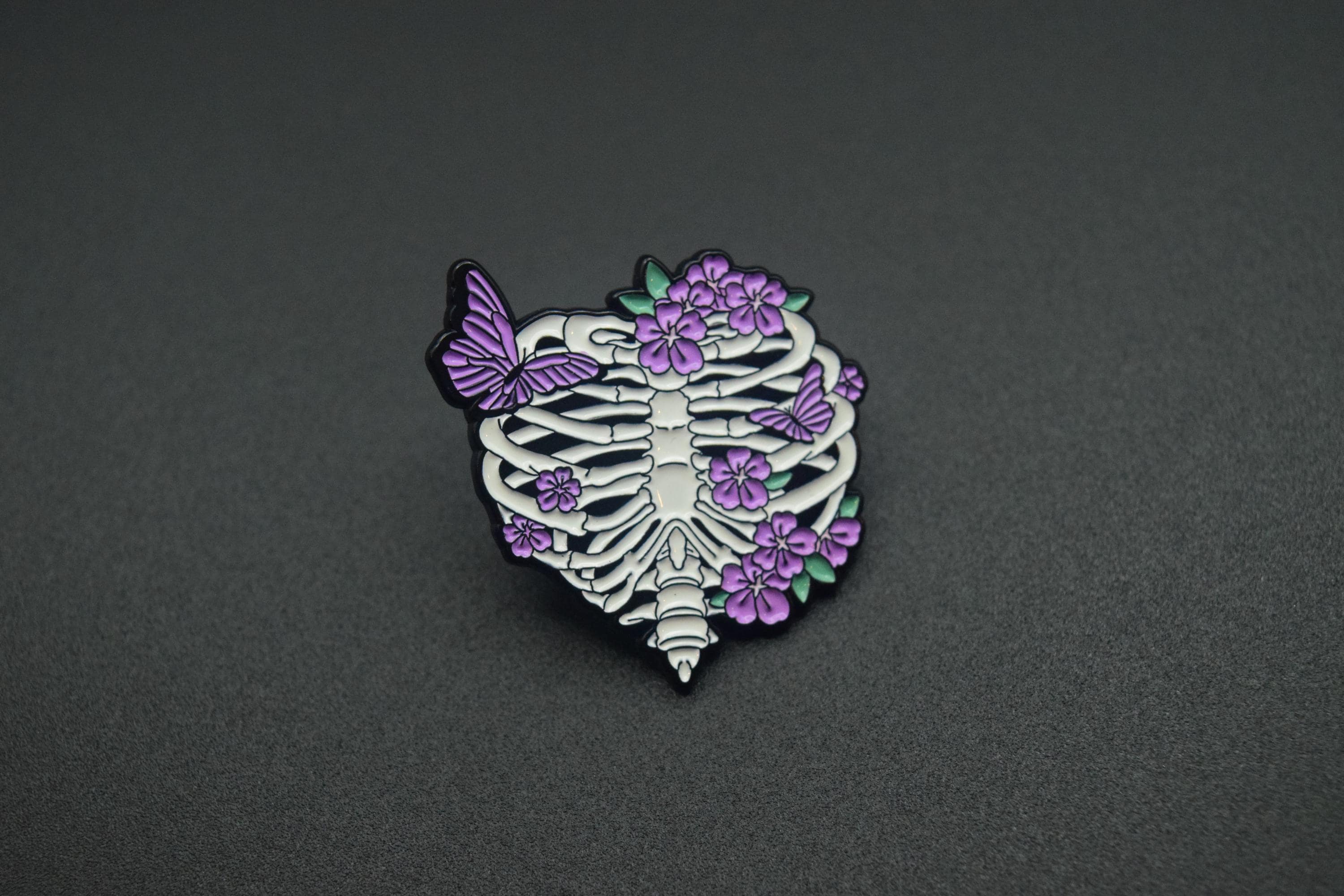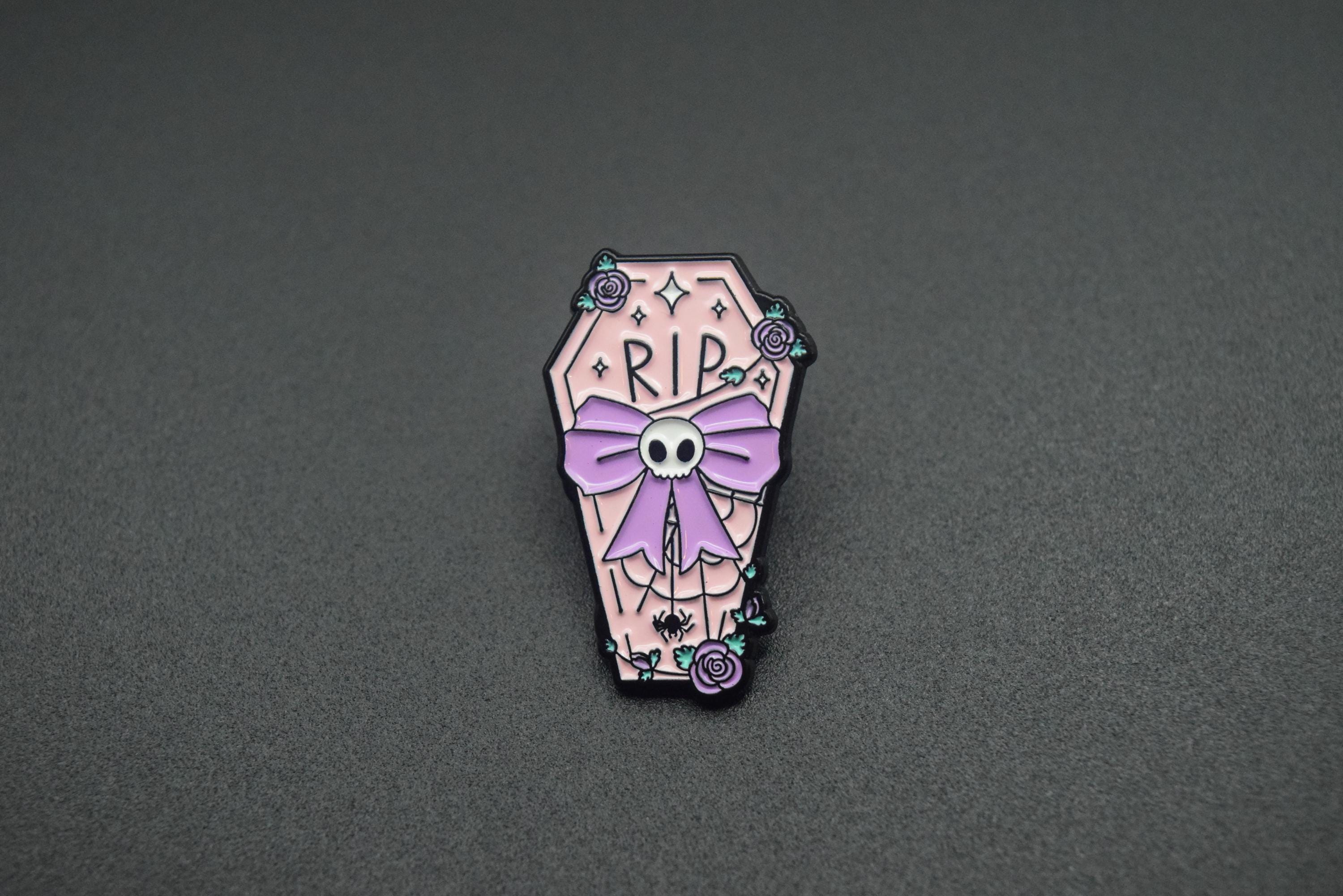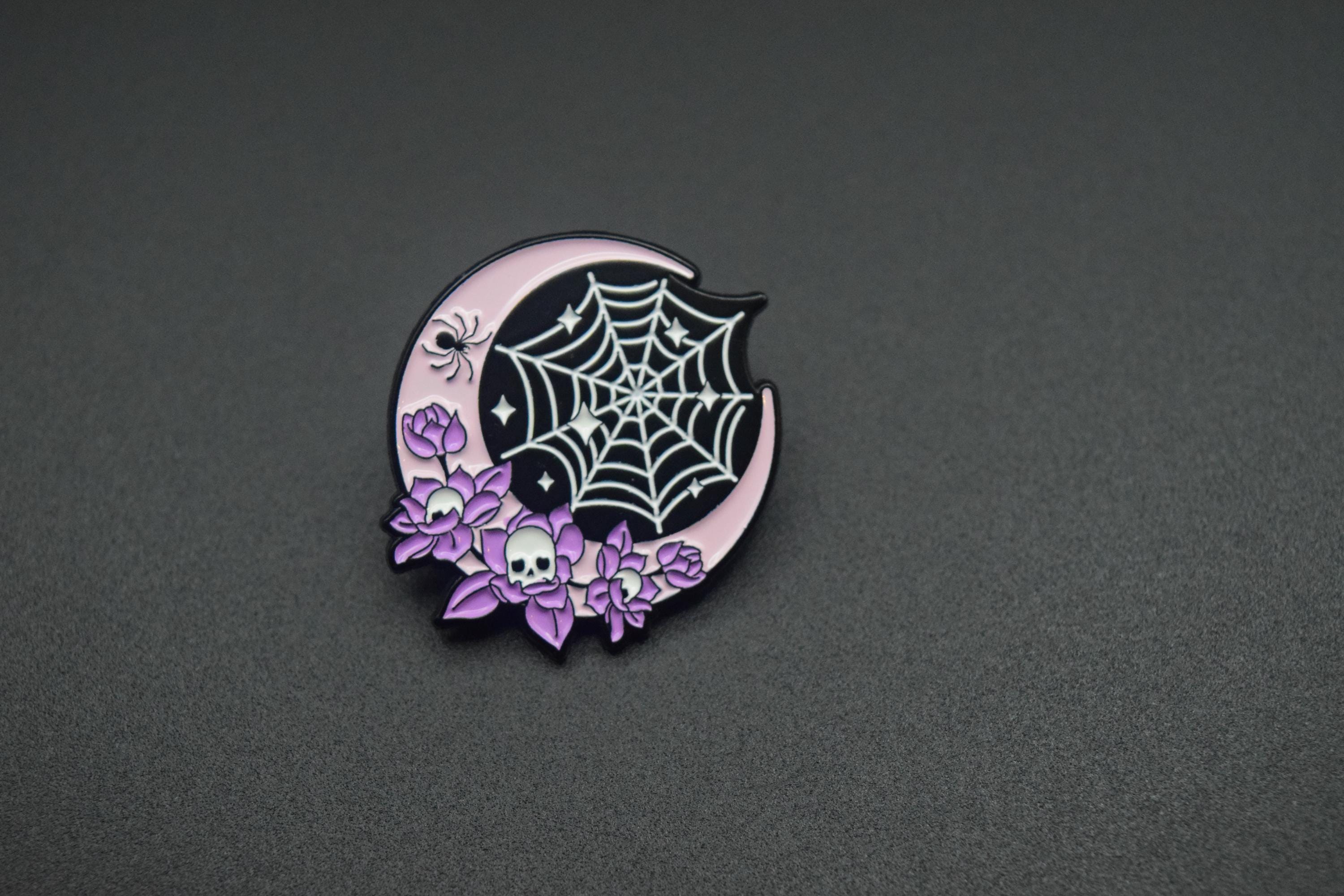 This adorable yet eerie four-piece enamel pin set blends pastel goth aesthetics with spooky charm. Featuring coffins, a tombstone, a spiderweb moon, and a floral skeleton rib cage, these pins are perfect for anyone who loves the Gothic or alternative style but with a softer, cuter twist.